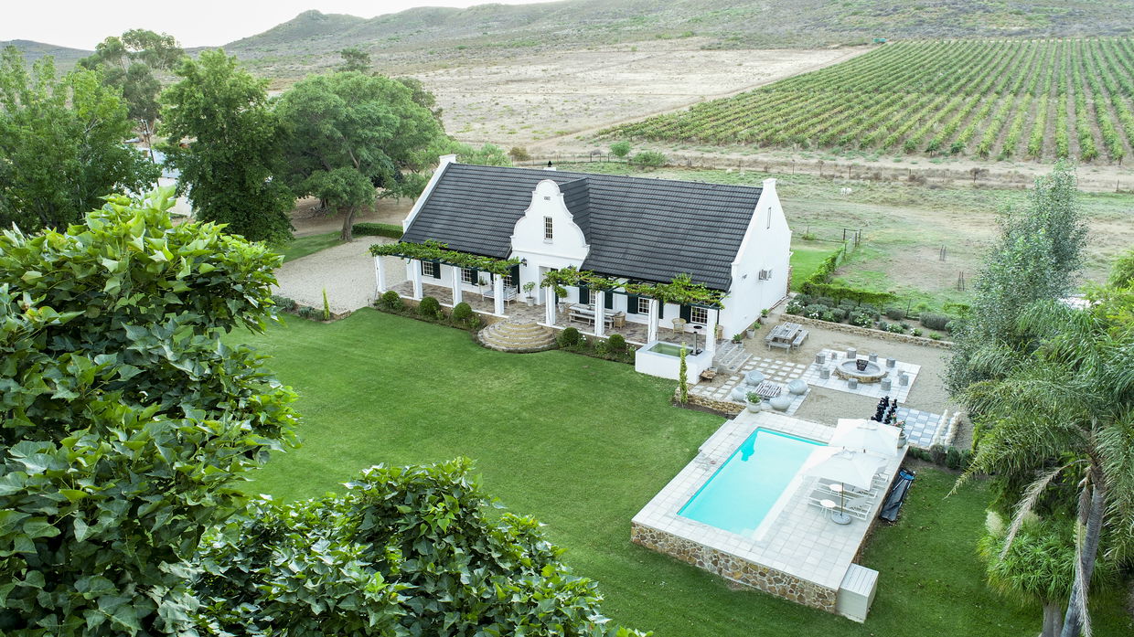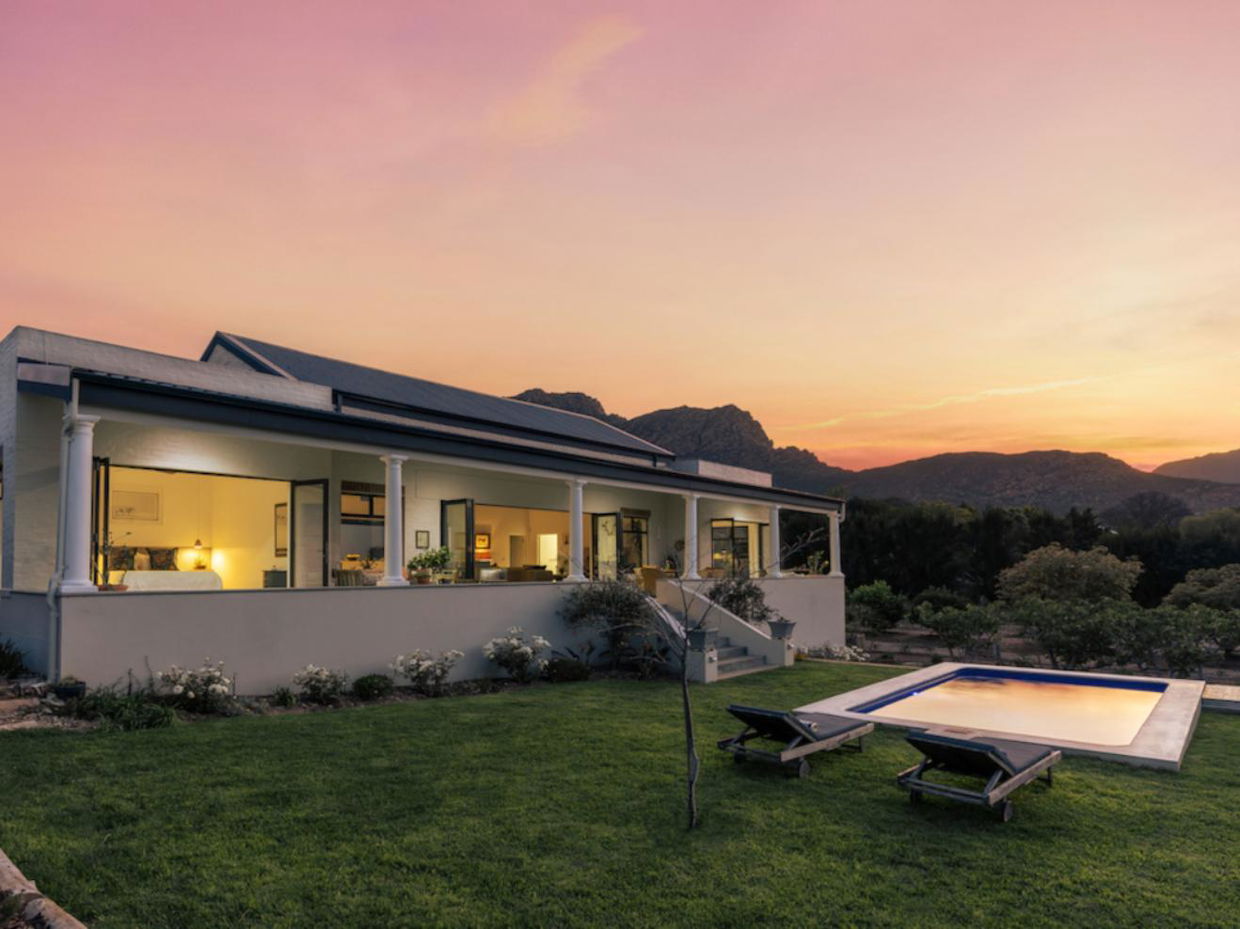 De Goede Hoop Farmstead offers a luxury hideaway located on a working wine farm in the picturesque Breede River Valley. The house beautifully blends classic farm style with contemporary touches, ensuring all the comforts of a modern home. With breathtaking mountain views, a pool, and a private hot tub, it's the perfect setting for relaxation. Evenings are best spent around the fire pit or braai area, enjoying fine wine and marvelling at the stunning starry sky after a day of exploring nearby wineries.