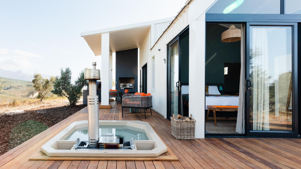 Untether Eco Pods; Hemingway, Columbus, and Romeo; offer the ultimate off-grid escape for couples seeking peace and connection in Wellington. Tucked among ancient olive trees and aromatic fynbos, these solar-powered sanctuaries embody sustainable luxury and total tranquillity. Each pod opens onto a private patio with a braai, pizza oven, and a sunken wood-fired hot tub, a recipe for relaxation. Beyond your secluded retreat, the surrounding farm invites exploration, with scenic trails for hiking, mountain biking, and birdwatching.