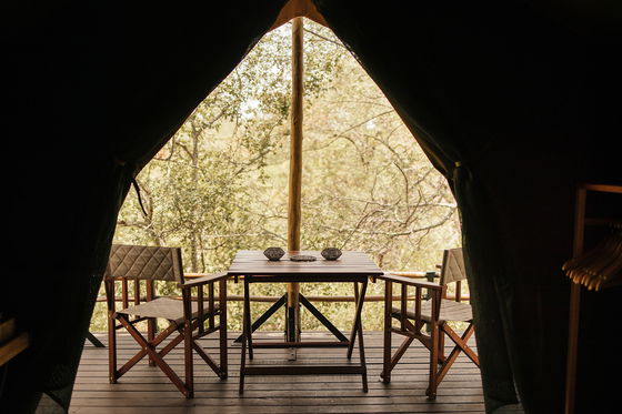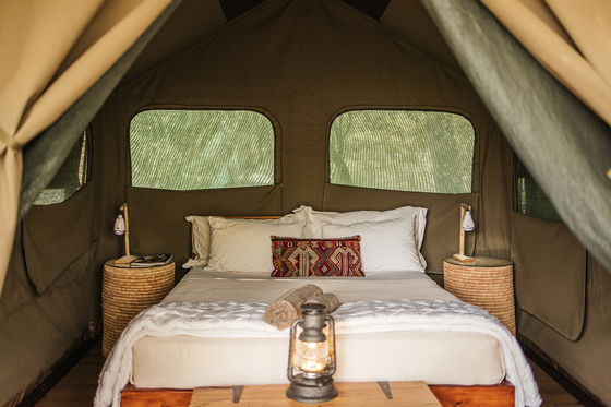 Built above a dry river-bed with stunning views, the Trails Camp features 2 en-suite safari tents on decks, and a beautifully appointed communal entertainment area with complimentary Wi-Fi, kitchen facilities, dining area, lounge, fireplace, pool, sundeck and boma all powered by solar energy.
