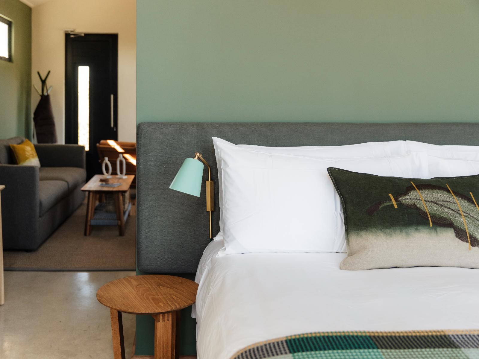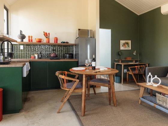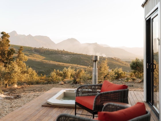 Ideal for a couple, Columbus Eco Pod has a bedroom with a king-size bed and en-suite shower, as well as outdoor shower and Wi-Fi. The kitchen contains a 2-plate gas stove, opening to a patio with braai facilities and wood-fired hot tub.