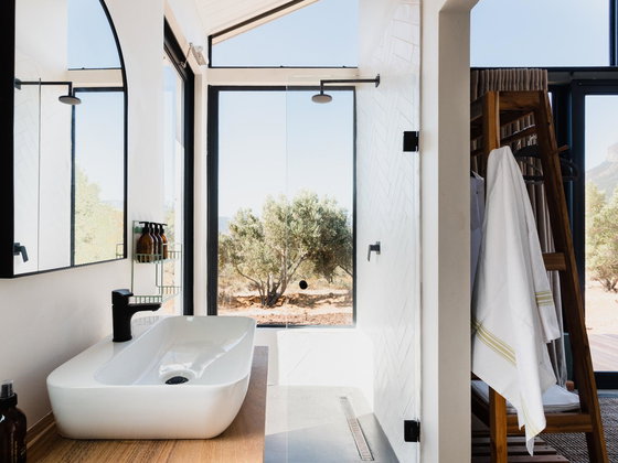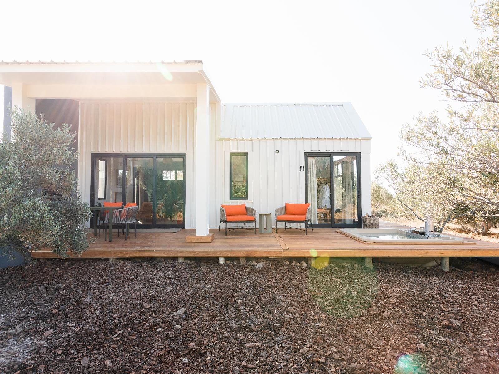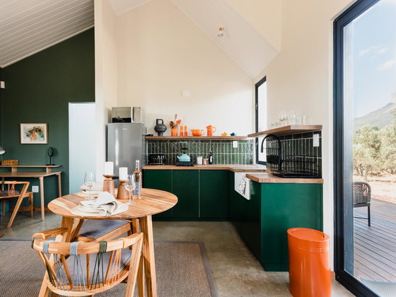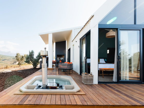 Ideal for a couple, Hemingway Eco Pod has a bedroom with a king-size bed and en-suite shower, as well as outdoor shower and Wi-Fi. The kitchen contains a 2-plate gas stove, opening to a patio with braai facilities and wood-fired hot tub.