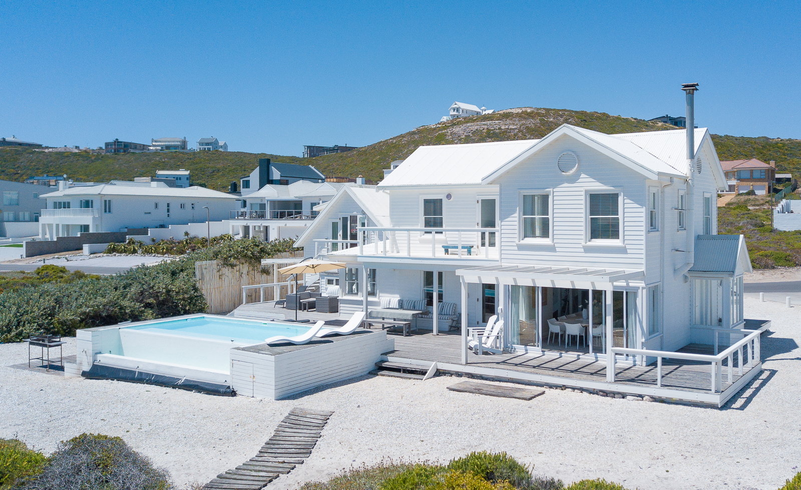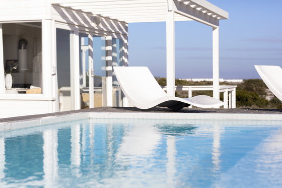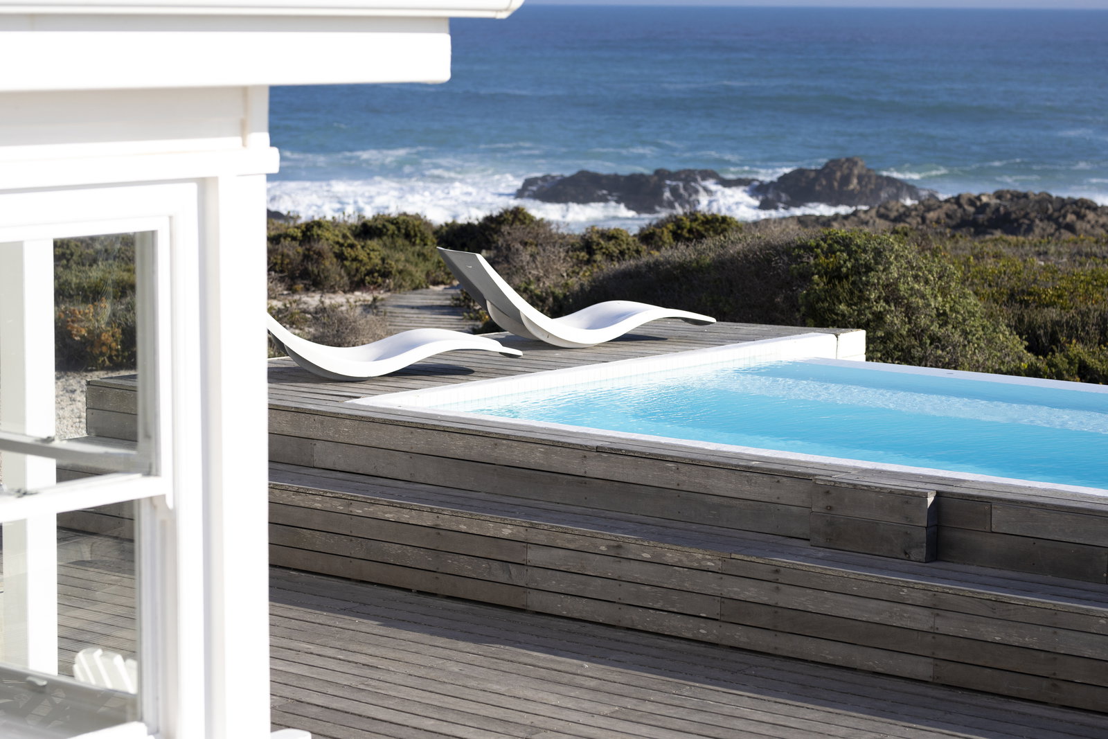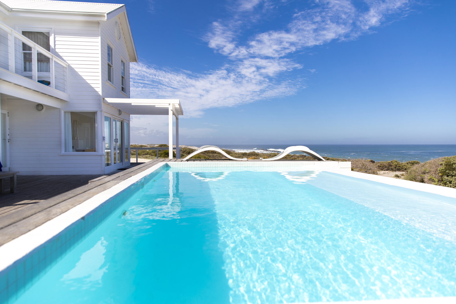 A gorgeous white wooden beach house, blending in blissfully with Yzerfontein's white sandy beaches. The crystal clear infinity pool on the deck accompanied by loungers offers the perfect retreat from reality.