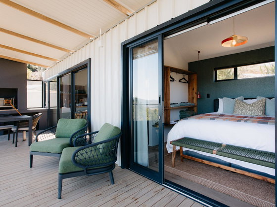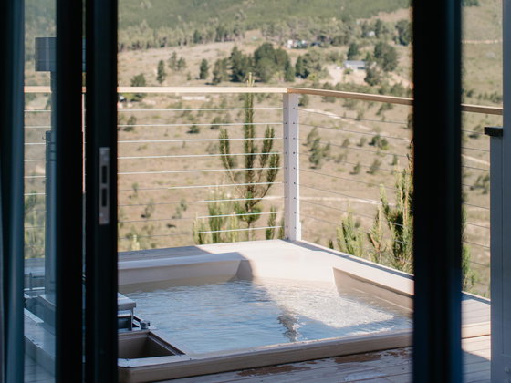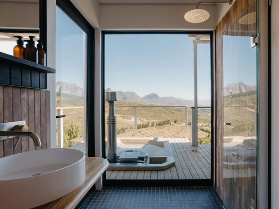 Ideal for a couple, Shackleton Eco Pod has a bedroom with a king-size bed and en-suite shower, as well as outdoor shower and Wi-Fi. The kitchen contains a 2-plate gas stove, opening to a patio with braai facilities and wood-fired hot tub.