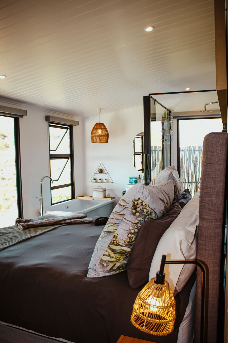 The cabin was thoughtfully designed and tastefully furnished to ensure maximum comfort and views from every angle. It has a double bed and a full kitchen (oven, gas stove, kettle, and fridge). In the room, there is a bath that is located close to the window to have a view of the natural landscape. Guests can take in the view fully with inside and outside shower. There is a Hot tub that is wood-fired with a custom-made hammock that overlooks the valley and the surroundings. There are board games and cards that you are welcome to use.