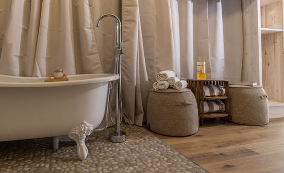 Sleep easy in the spacious king sized beds, each tent is fitted with a shower and freestanding bath with lovely amenities including bath salts, shower gel and shampoo. Bath and swimming towels are also provided.