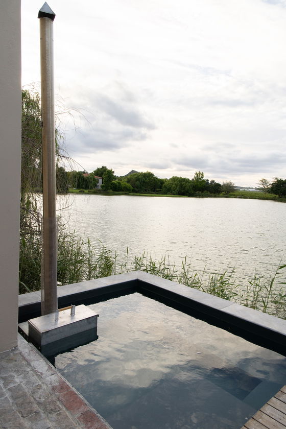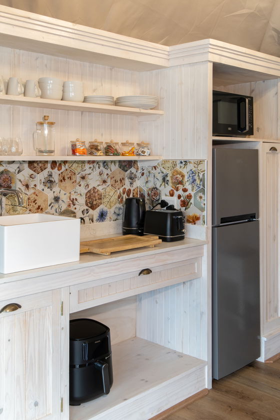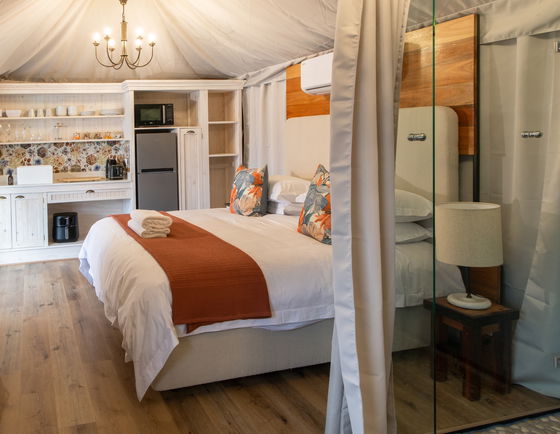 Each luxury lakeside glamping tent has a private covered patio with easy access to the private wood fired hot tub and braai facilities. The kitchen is partially equipped with an airfryer, toaster, kettle, microwave, french press, braai casserole and fridge/freezer.