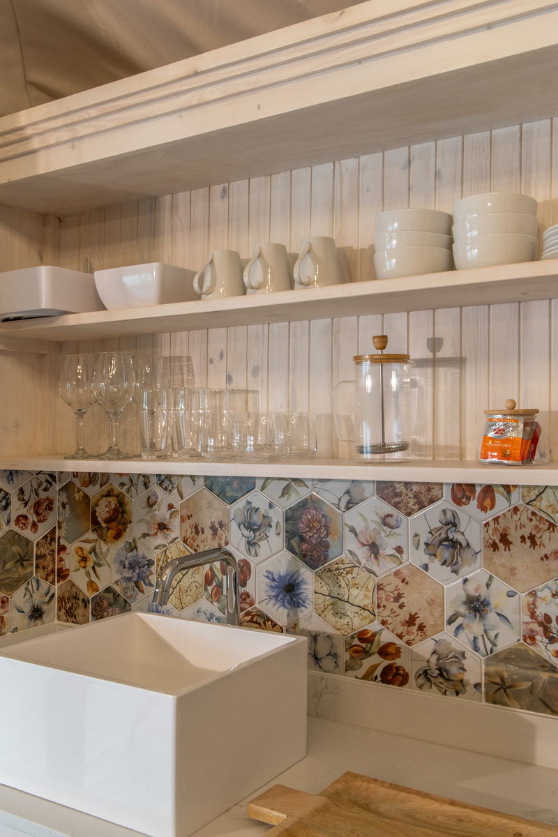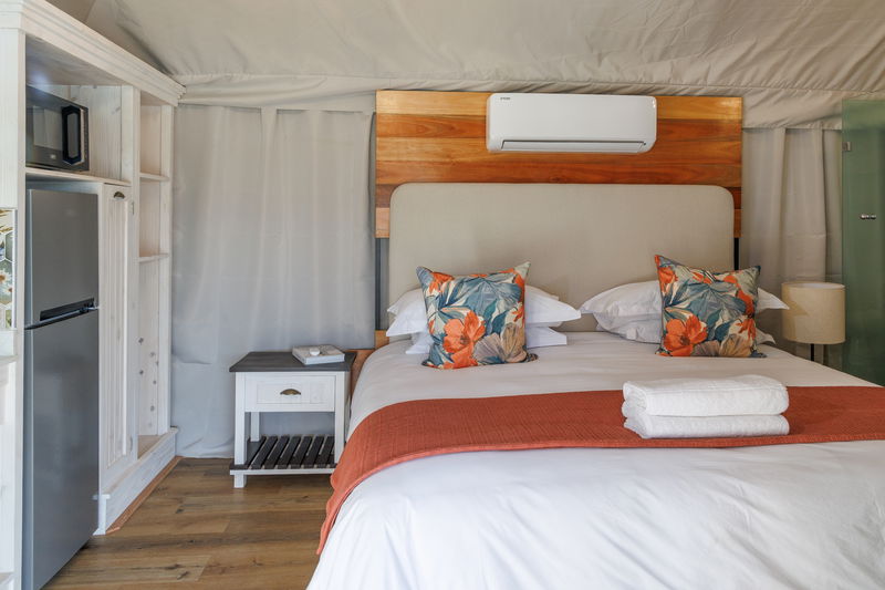 Each luxury lakeside glamping tent has a private covered patio with easy access to the private wood fired hot tub and braai facilities. The kitchen is partially equipped with an airfryer, toaster, kettle, microwave, french press, braai casserole and fridge/freezer.