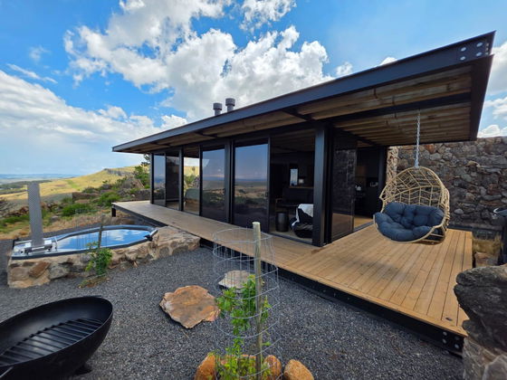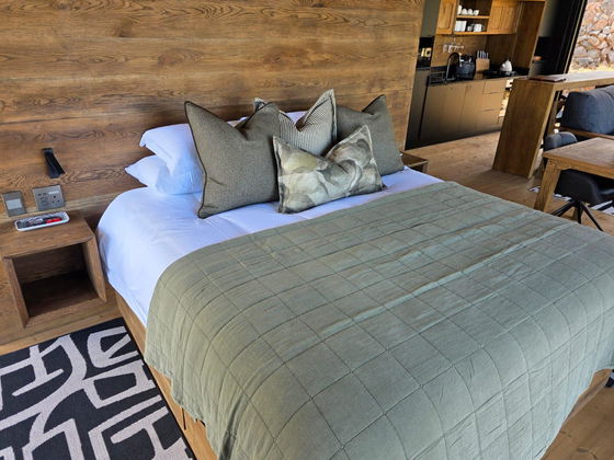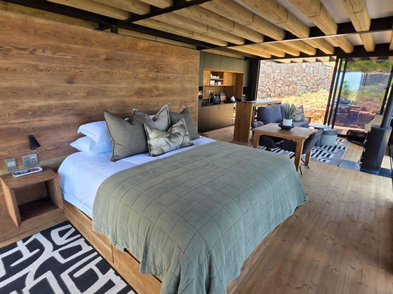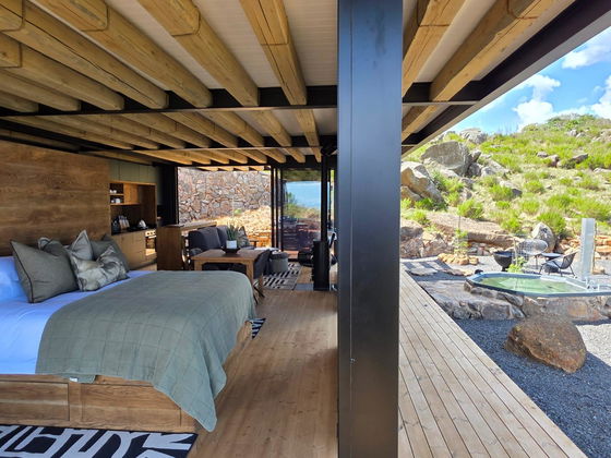 A contemporary open-plan cabin featuring a king-size bed, bathroom with an in-and outdoor shower, lounge area with a couch and dining nook, fully equipped kitchenette, boma braai area and wood-fired hot-tub. Only accessible with 4x4 vehicle or helicopter.