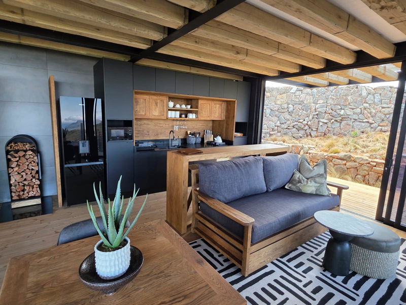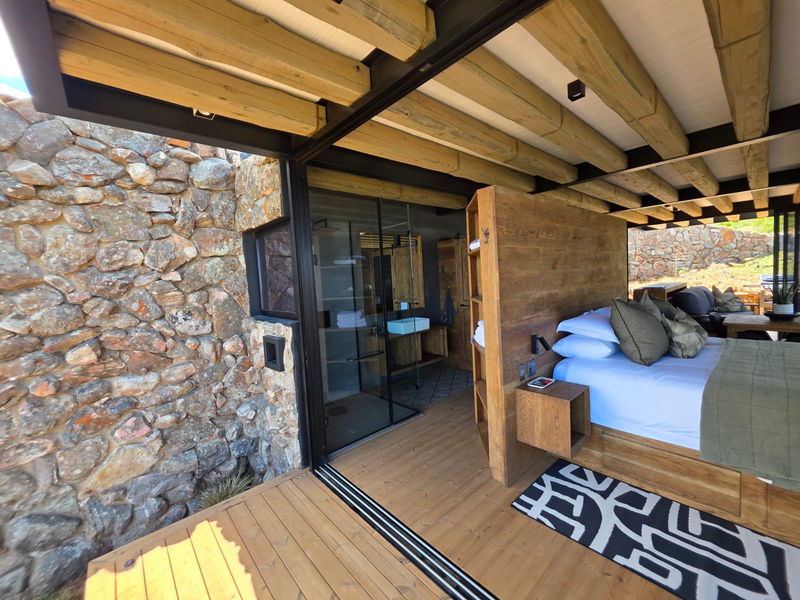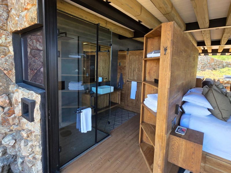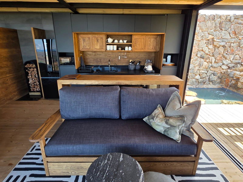 A contemporary open-plan cabin featuring a king-size bed, bathroom with an in-and outdoor shower, lounge area with a couch and dining nook, fully equipped kitchenette, boma braai area and wood-fired hot-tub. Only accessible with 4x4 vehicle or helicopter.