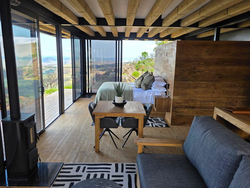 The cabin is open-plan and fitted with fully stackable doors onto a wrap around wooden deck. The living zone has a small dining room table, a couch and a kitchen nook with a table to prepare meals. The kitchen has a gas hob, full fridge and an oven.