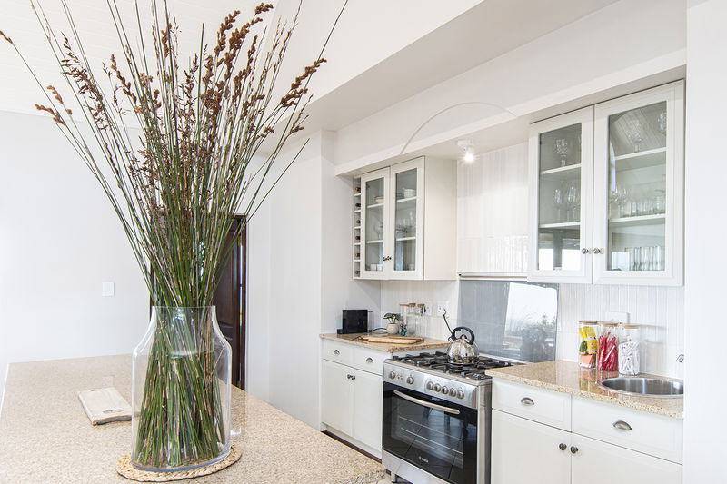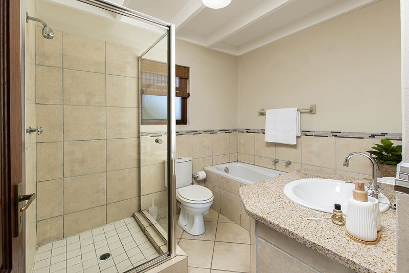 At the heart of the home is a bright, double-volume open-plan kitchen, dining, and living area designed for easy entertaining and relaxed living. The fully equipped kitchen includes a 4-plate gas stove, an oven, a Nespresso coffee machine, full kitchenware and utensils. Gather around the large dining table that seats eight, or cosy up in the living area with an indoor fireplace/braai and smart TV for evening entertainment. There is a separate utility room with a washing machine, dishwasher, fridge-freezer, and microwave.