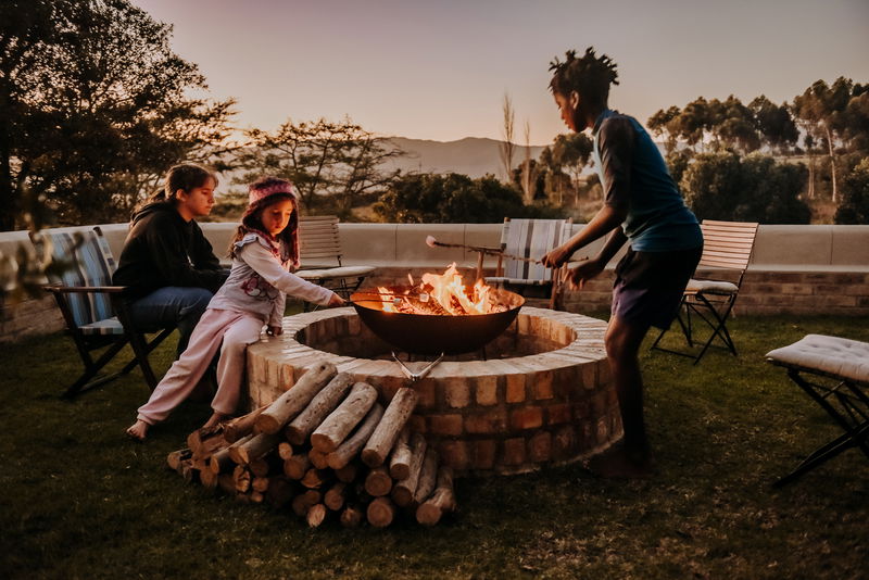 The living room opens onto a covered patio with outdoor seating and a built-in braai area overlooking the farmlands. This extends onto manicured gardens with a fire pit and plenty of seating space to gather around with your crew.