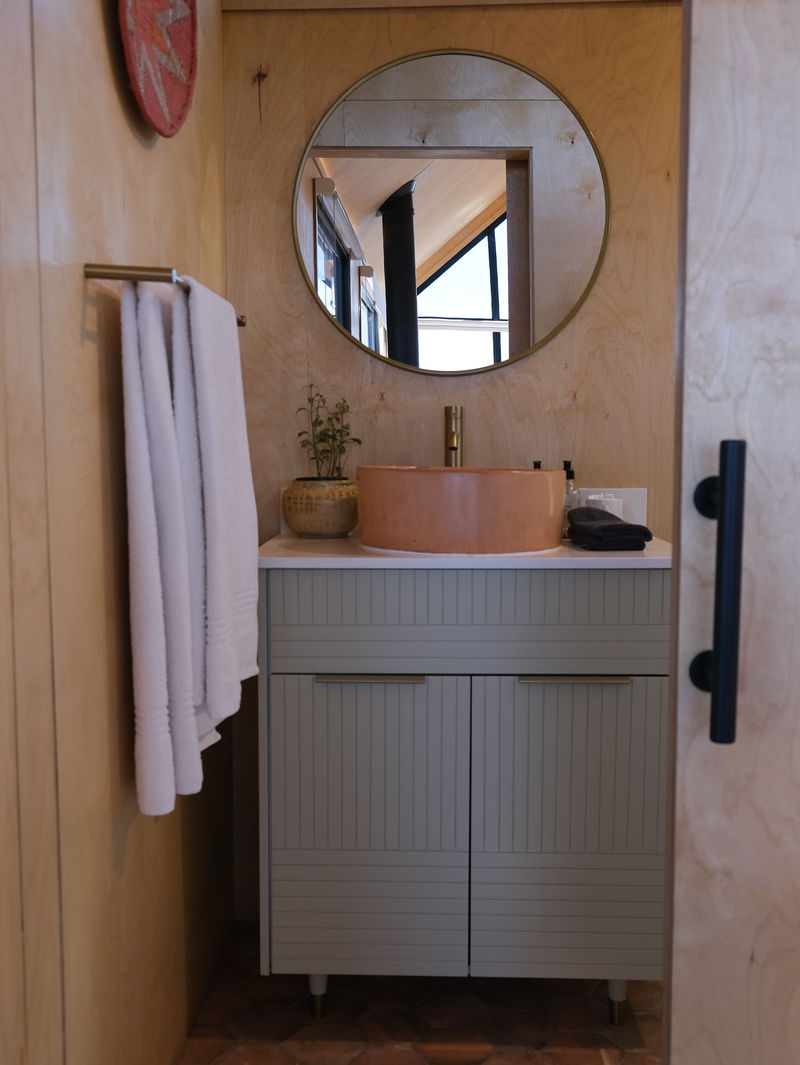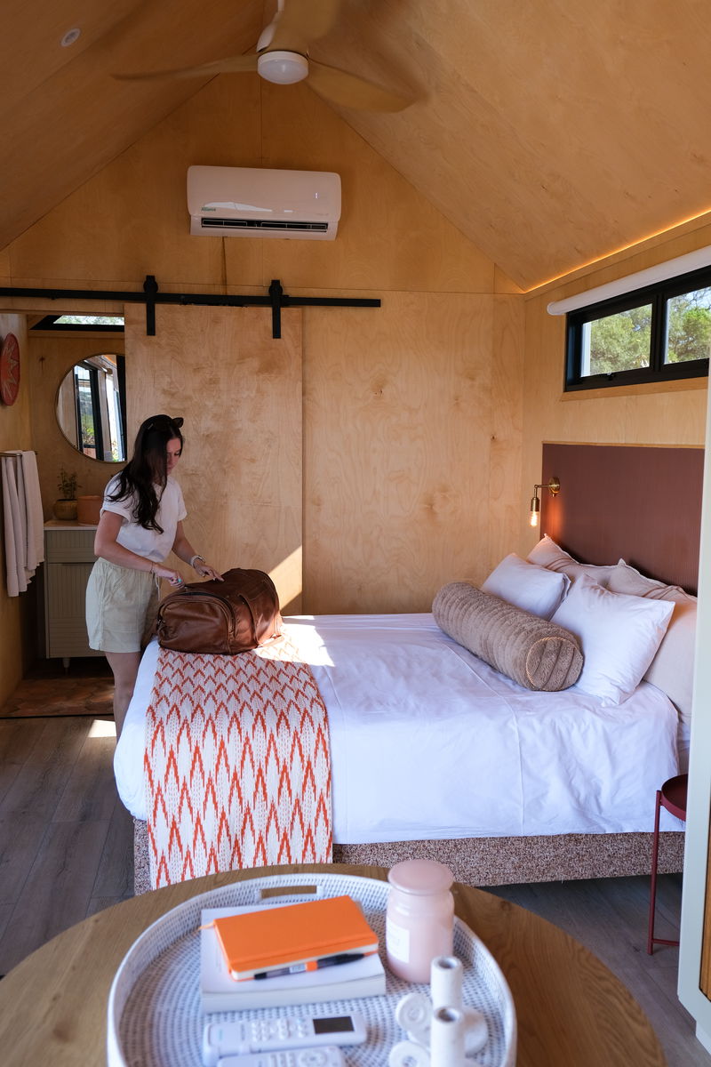 The cabin has an open plan layout with a separate bathroom. Centrally located, the wood burning fireplace offers a cosy space during the winter months. The kitchen is compact yet offers all the basic facilities to prepare your own meals including a gas hob and fridge.