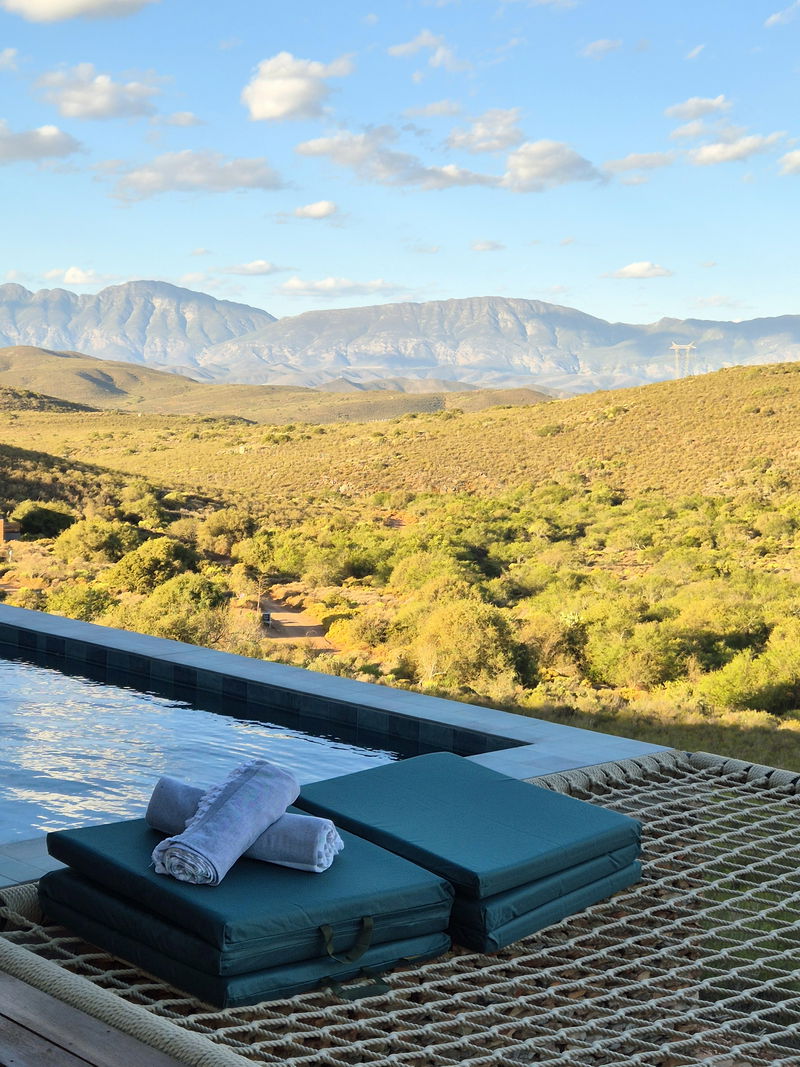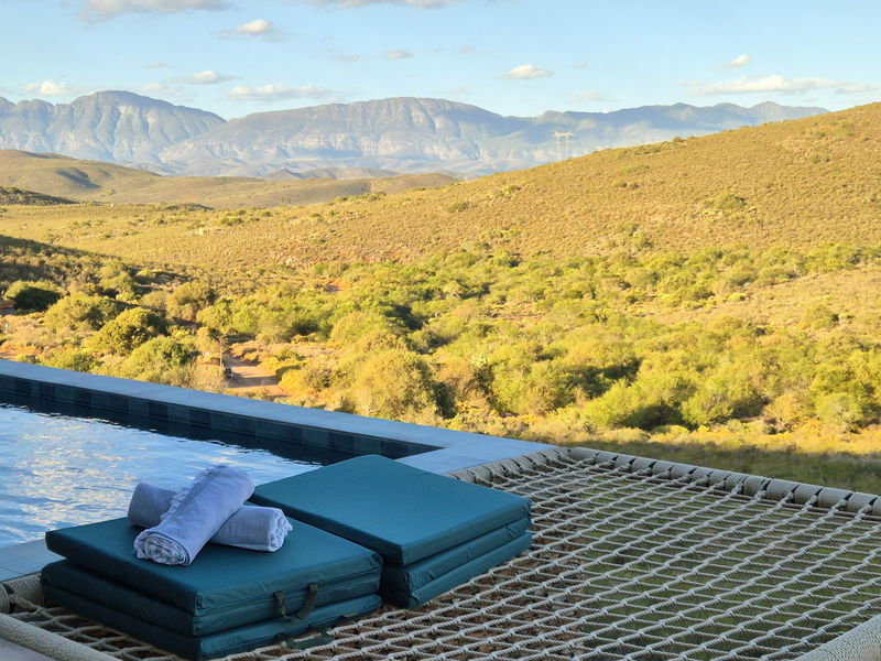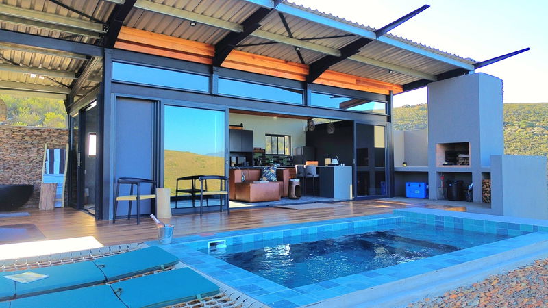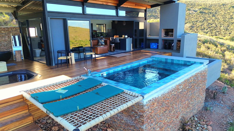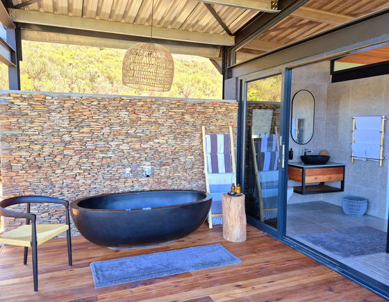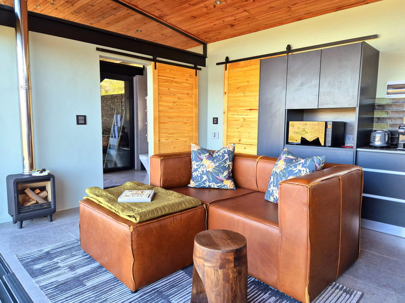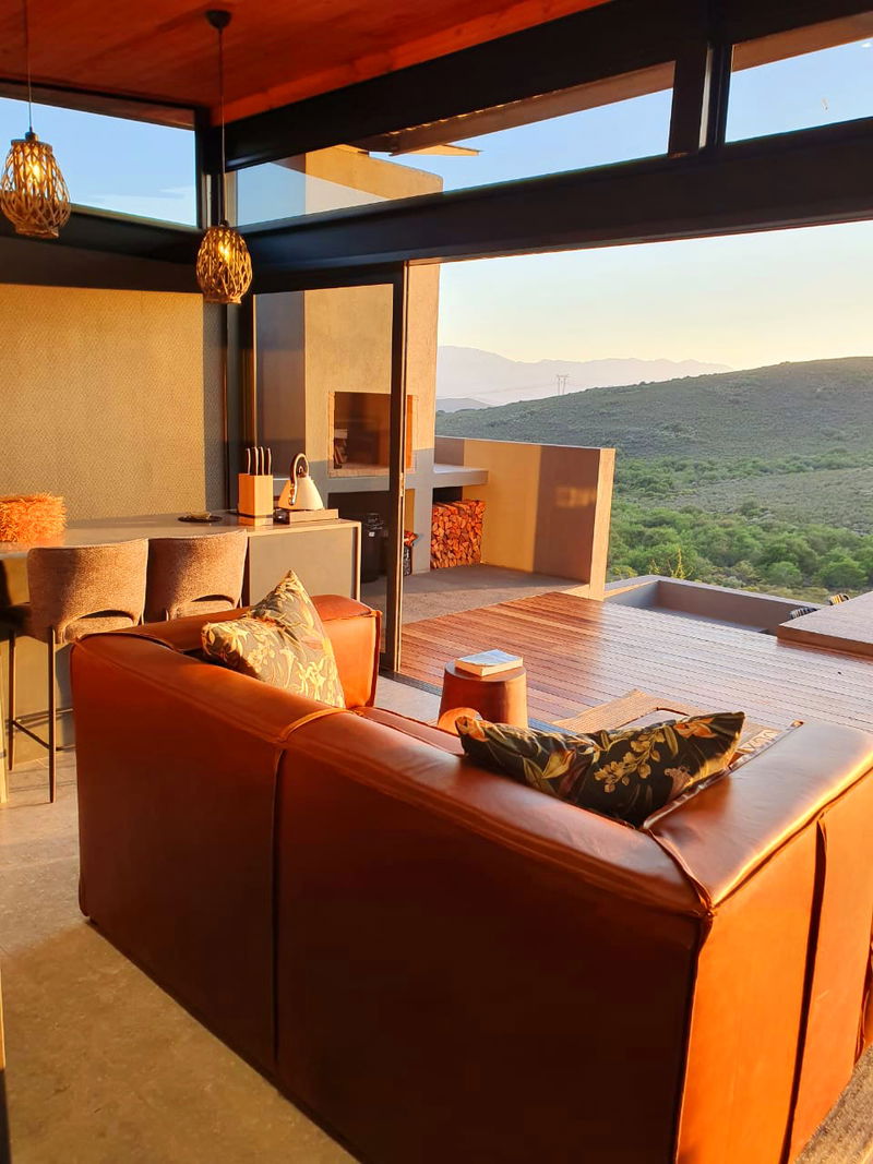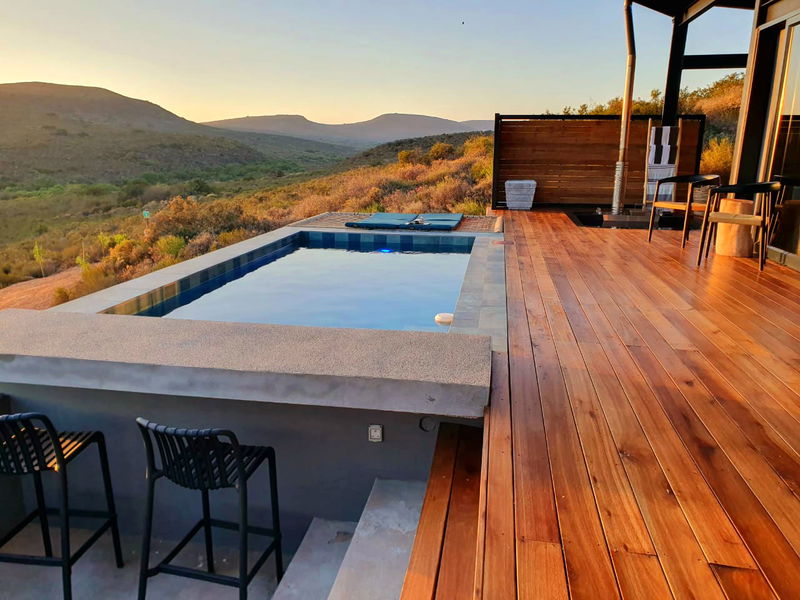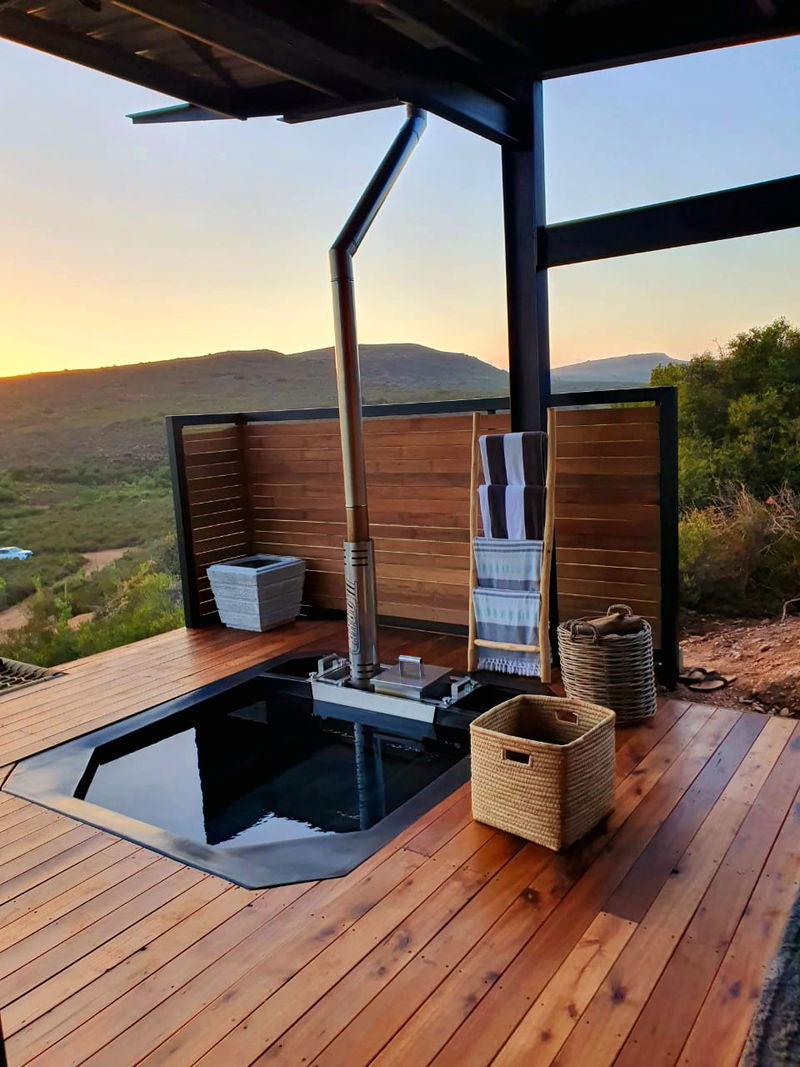 This luxury stay offers spectacular views from an undercover wrap-around deck, overlooking a breathtaking private pool perfect for cooling down on hot summer days. During cooler weather, a wood-fired hot tub or indoor fireplace will keep you warm and cozy. Enjoy refreshing dips in the pool, relax in the hot tub or find peace in the hammock. Our well equipped braai facilities and inviting sunken boma are perfect for memorable evenings, where you can savour romantic sundowners with the fire crackling in the background.