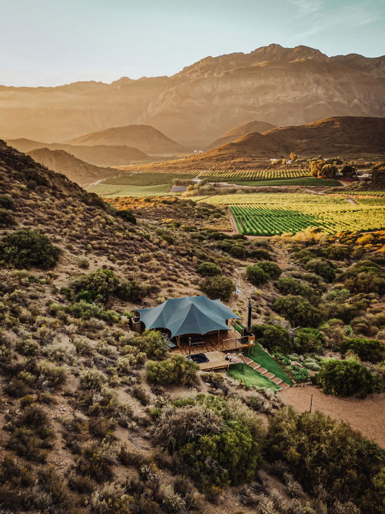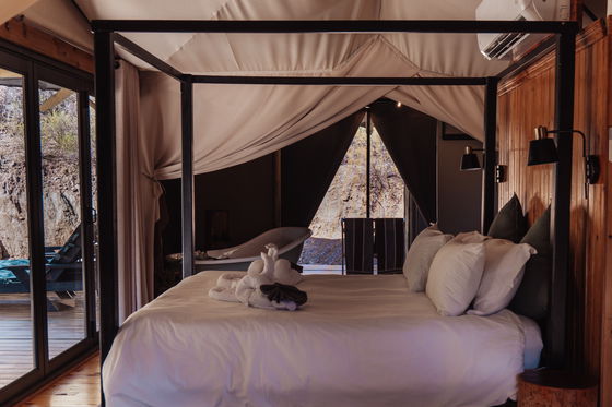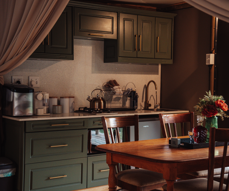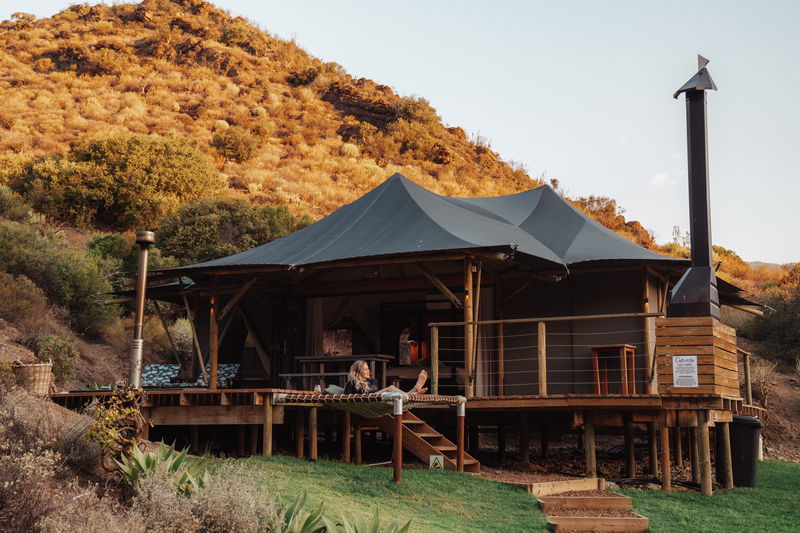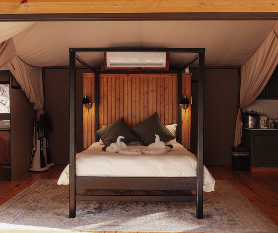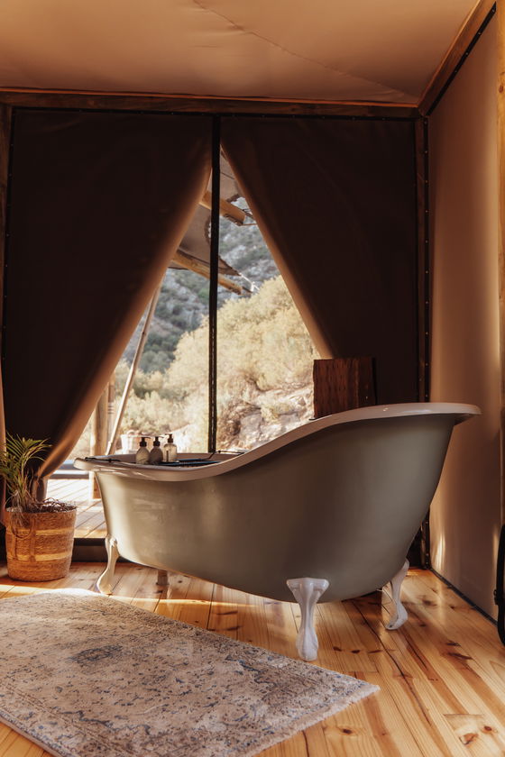 Outdoors meets modern glamping. Ontevreden Tent features an open plan bedroom with a freestanding bath and a separate bathroom. The bedroom offers a comfortable Queen sized bed. The kitchen is equipped with a gas stove, fridge, and microwave oven.