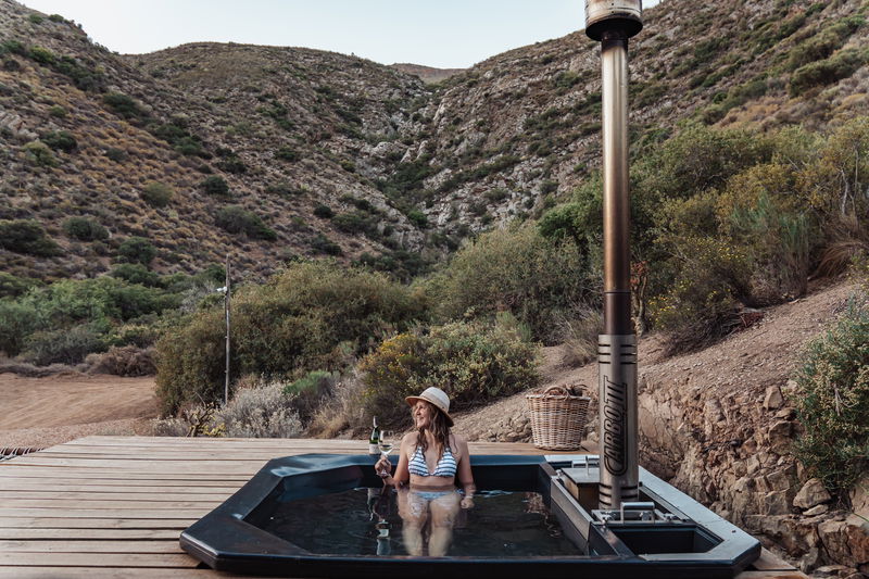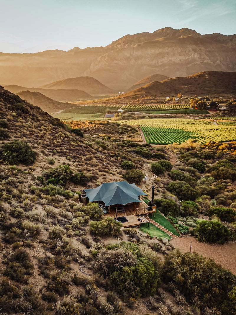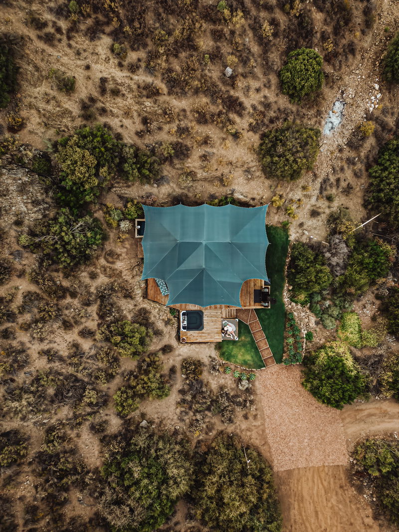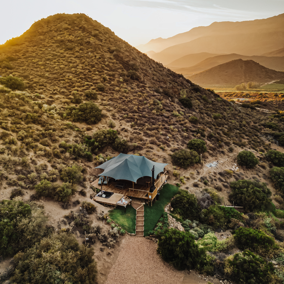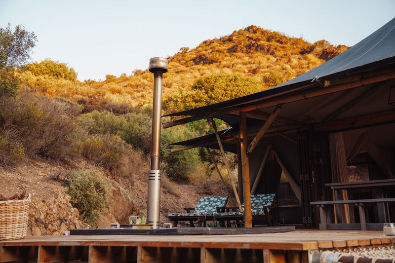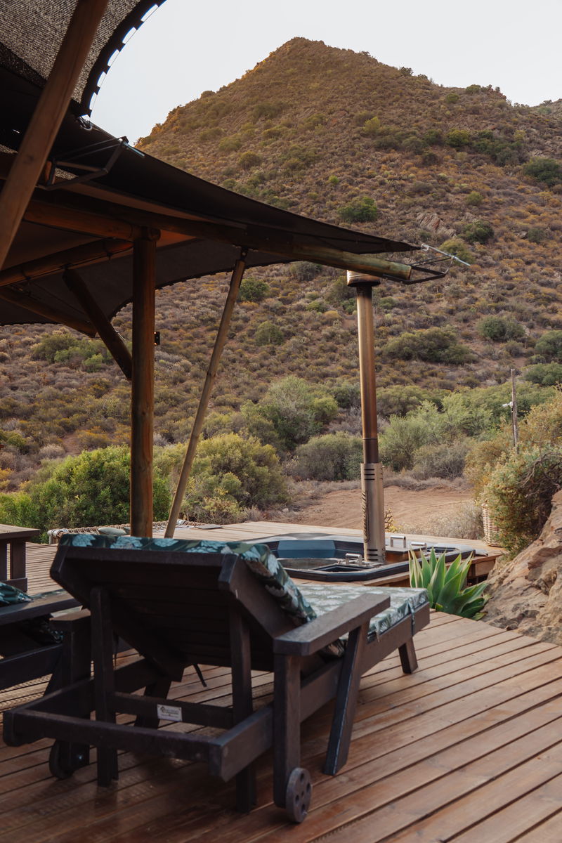 This fully furnished tent consists of 1 bedroom with an en-suite bathroom and outside shower. The small living area is complimented by a wood-fired hot tub and a braai on the deck. Offering a secluded location with lovely mountain views.