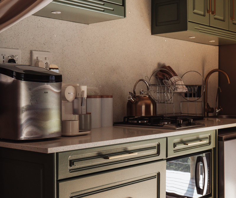Coffee pods, tea, salt, pepper & braai salt is provided as well as a decanter with complimentary sherry.