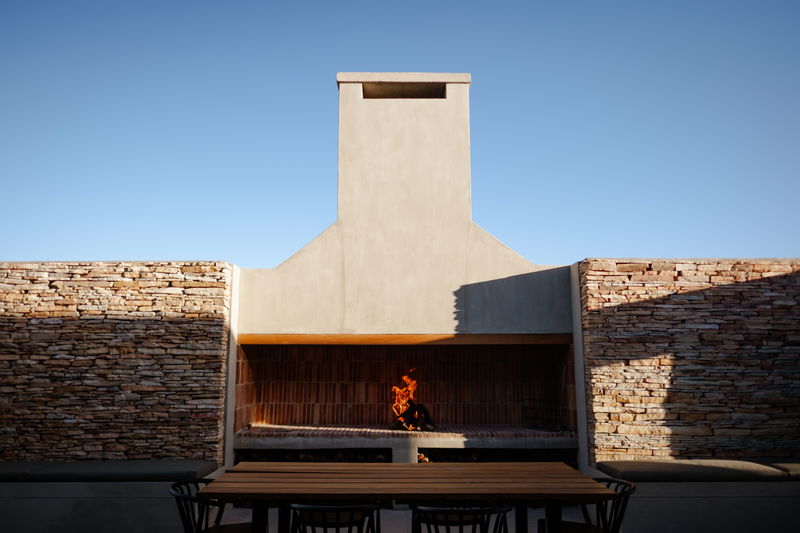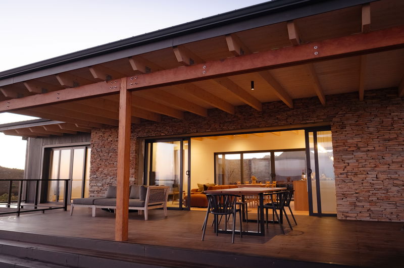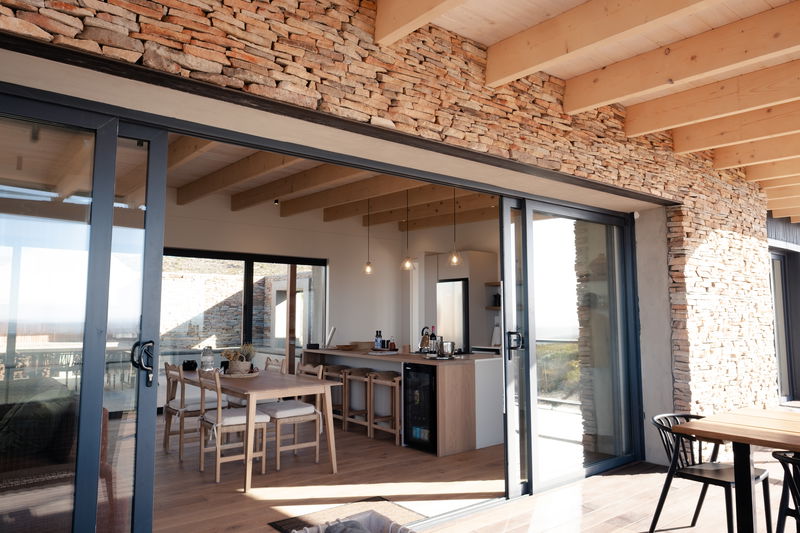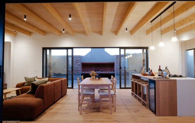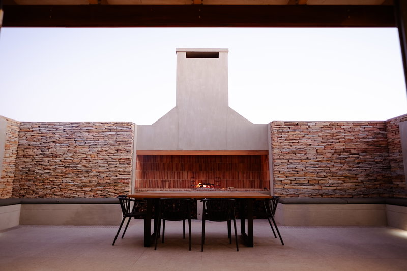 Large sliding doors disappear into the walls, opening the space onto a north-facing wooden deck, partly covered, with the hot tub set in the open section, perfect for stargazing. On the southern side, another set of sliding doors leads to an enclosed braai area under open skies.
