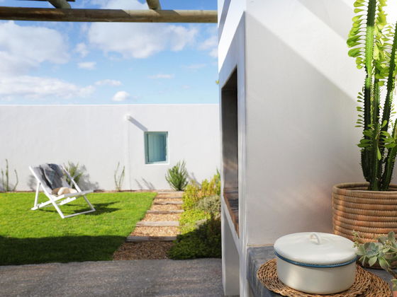 The braai area is surrounded by a garden filled with the delightful scents of bay leaves and olive trees, offering a private and tranquil outdoor space for relaxation and dining at the large table.