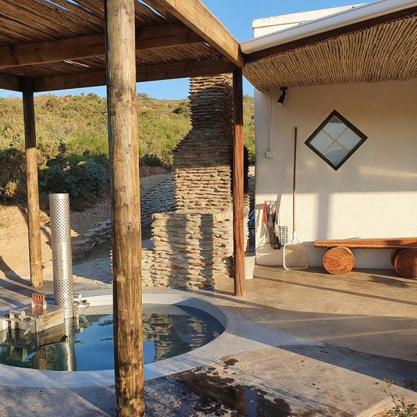 The living room has an open fireplace as well as an electric heater for cold winter nights, and leads into the fully equipped kitchenette. Outdoors is a shaded stoep with sun loungers, plunge pool with wood-fired oven/hot tub as well as a braai area.