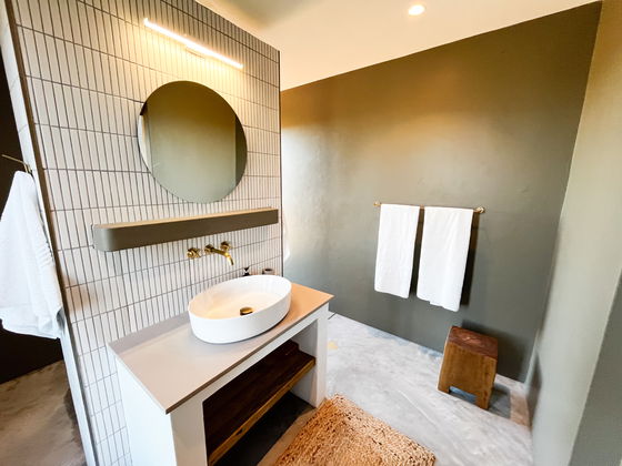 Vaulted ceilings that echo the vast sky above. Minimalist luxury with clean lines and soft textures. Indoor fireplace for cozy evenings. Private outdoor spaces with your own wood-fired plunge pool. Solar-powered, sustainably built for conscious comfort.