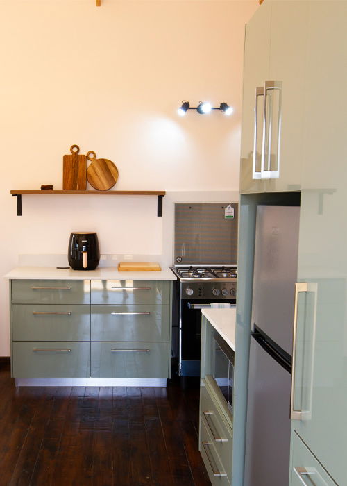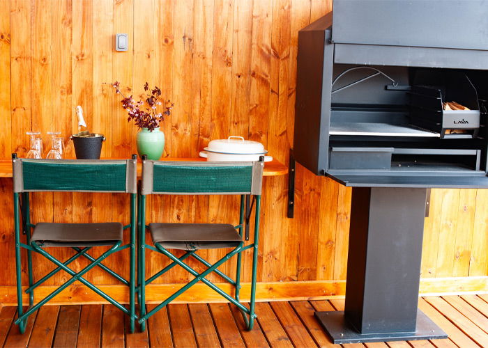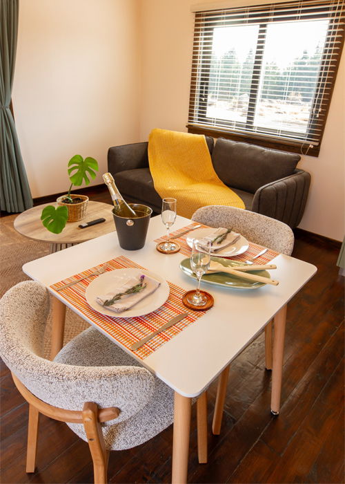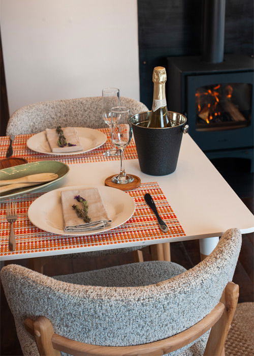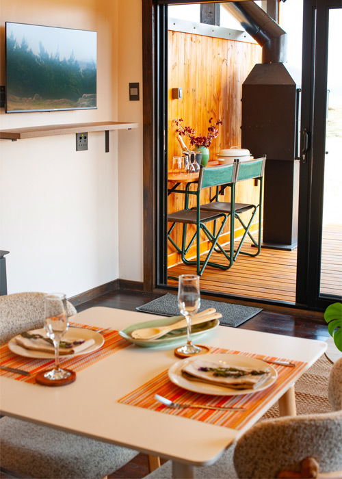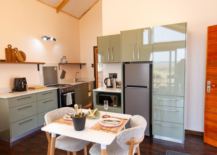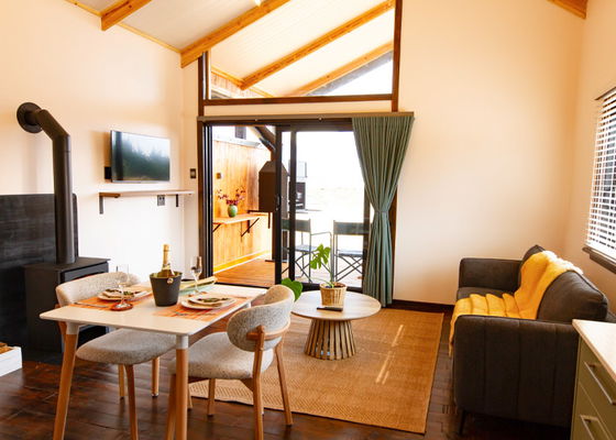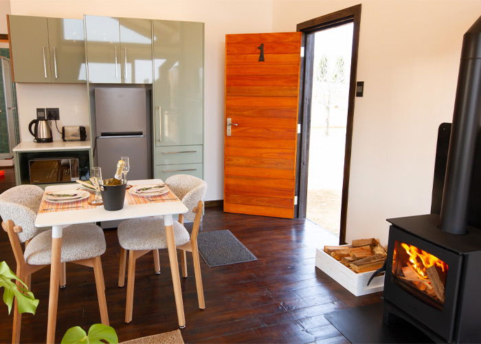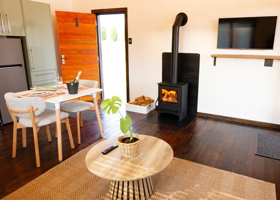 Inside, careful attention has been given to both style and comfort. The open-plan kitchen is fully equipped with a gas stove, oven, microwave, fridge, and air fryer. Furthermore, the kitchen flows seamlessly into a dining area for two and a cozy lounge with a fireplace, ensuring guests feel right at home.
