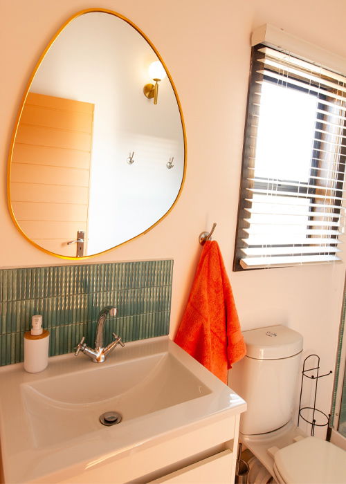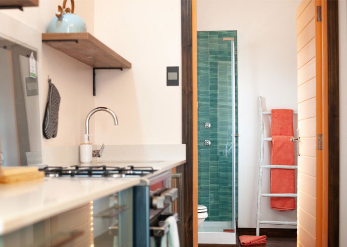 The queen-sized bed and private bathroom complete the cabin with an upmarket and inviting atmosphere.The bathroom features a shower with a clean, modern finish. In combination, the bedroom and bathroom provide a private and comfortable setting where guests can unwind with ease.