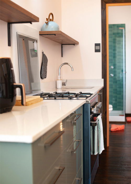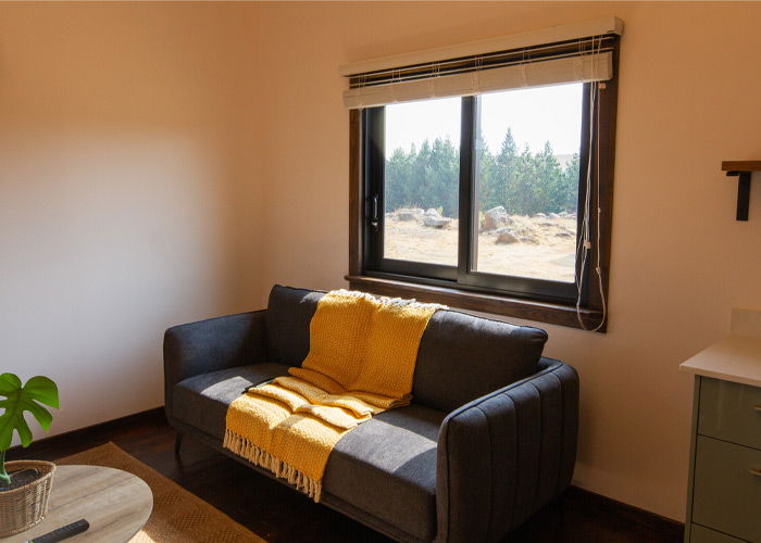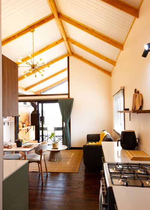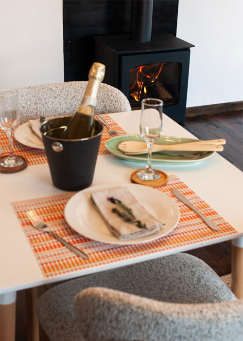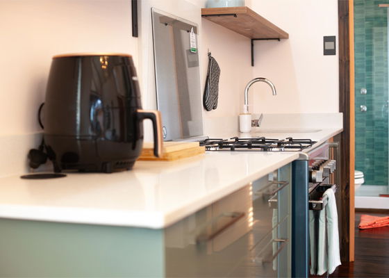 Inside, careful attention has been given to both style and comfort. The open-plan kitchen is fully equipped with a gas stove, oven, microwave, fridge, and air fryer. Furthermore, the kitchen flows seamlessly into a dining area for two and a cozy lounge with a fireplace, ensuring guests feel right at home.